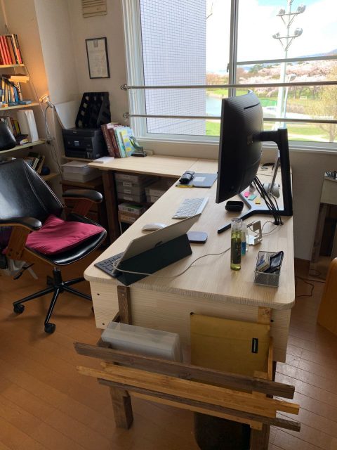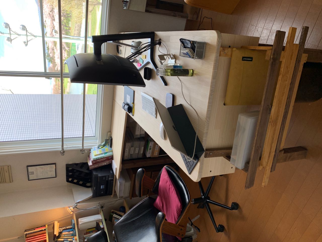 最新作のパソコンデスクです。1800×700のデスクを2台、108度の微妙な角度で連結させるという大仕事でした。スタジオひっぽでは組み立てができないので、現地にお邪魔して仕上げました。おまけで、サイドにマガジンラックをサービス!ぐらつくことがないように目立たない補強をどうつけつけるか悩みながらの挑戦でした。