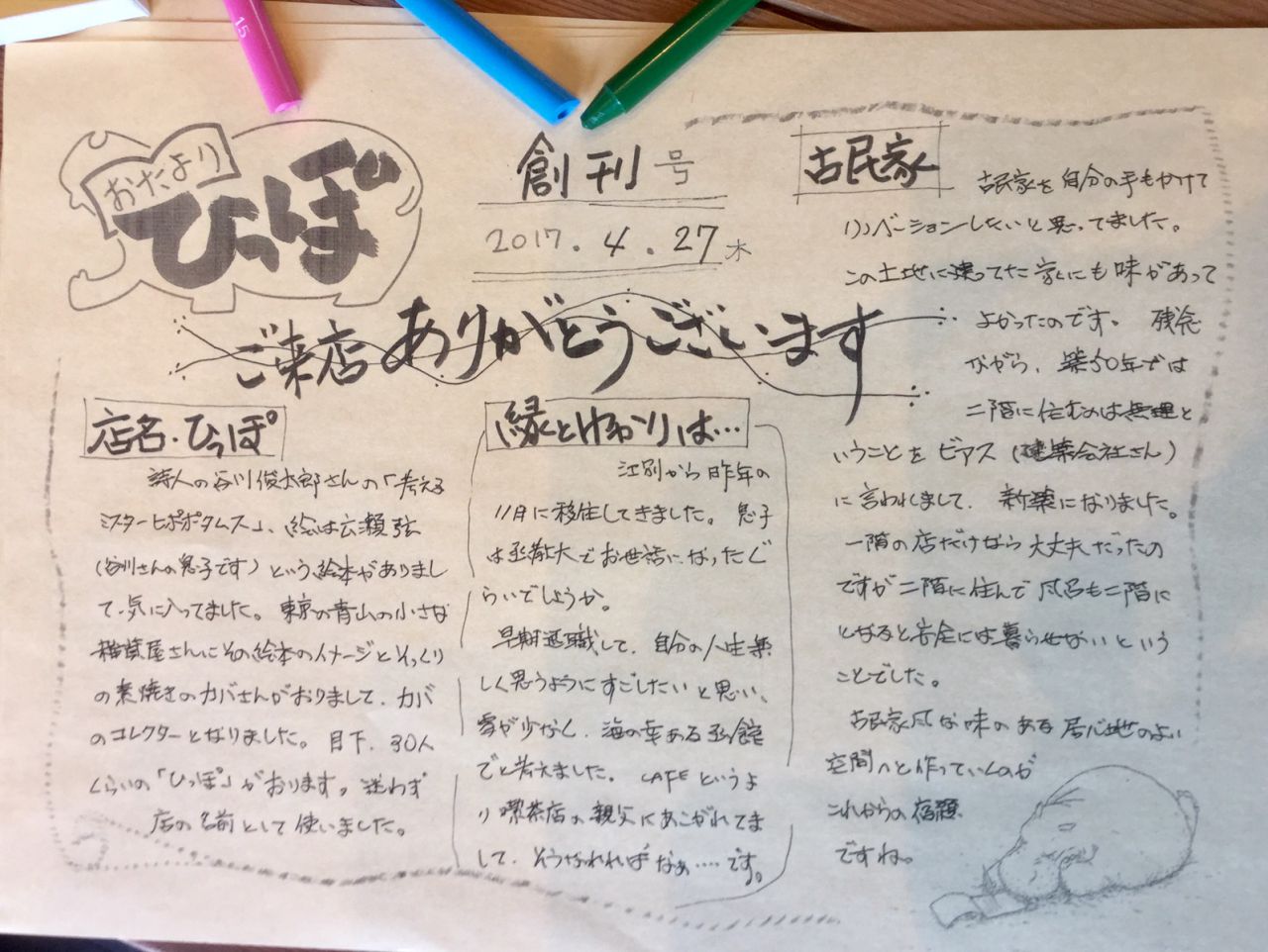 ひっぽのオープン当日に創刊号を発行しました。店の名前、開店のいきさつなど尋ねられる前に分かっていただこうとの思いでした。それ以降、2週間に1枚、年間25号のペースで発行することにしました。教員の頃は、年間200日の登校日数に対して120号くらい発行していましたから、その延長というか職業病ですね。書き手の気持ちもよく伝わると思い、昔から手書きにこだわっています。電子メールよりも原始メールのハガキに通じますかね。