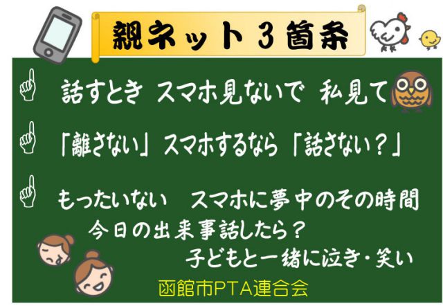 ネット利用時に心がけたい親ネット3箇条。子どもに注意する前に、まずは自分自身ができているかな?と振り返ってみたいですね。