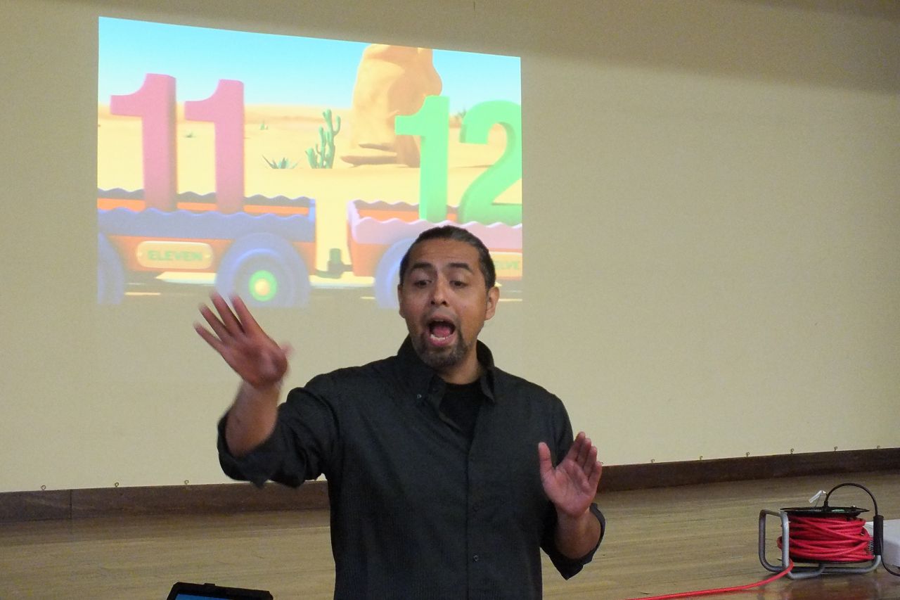 自作のイラストや映像をタブレットに取り込み、プロジェクターを効果的に活用して、視聴覚に訴えながら進めています。