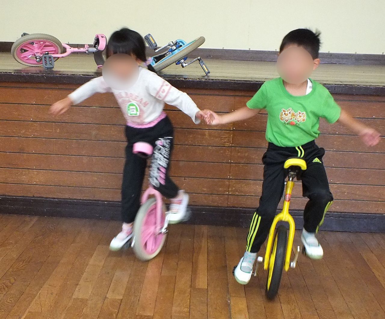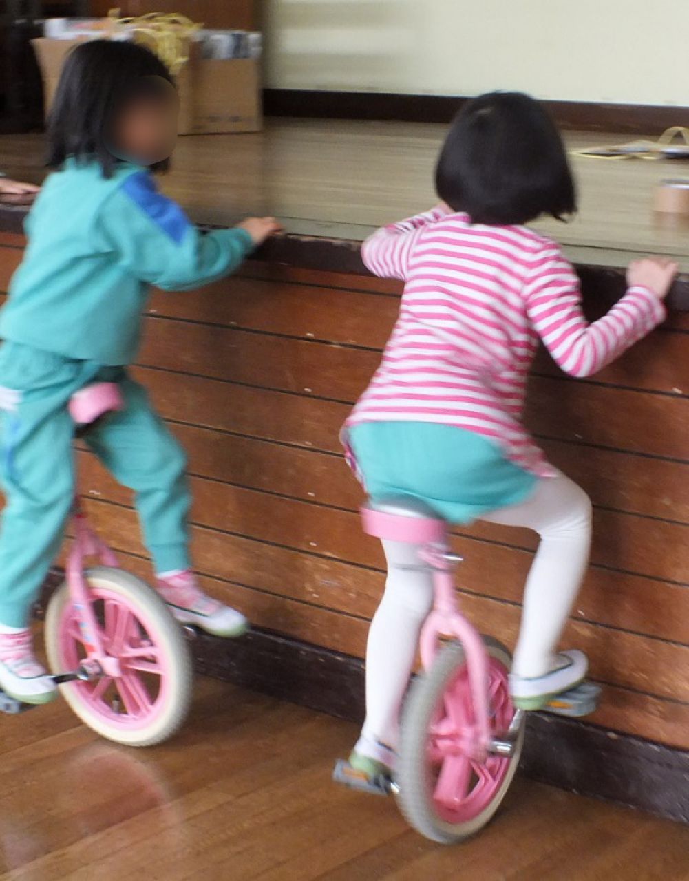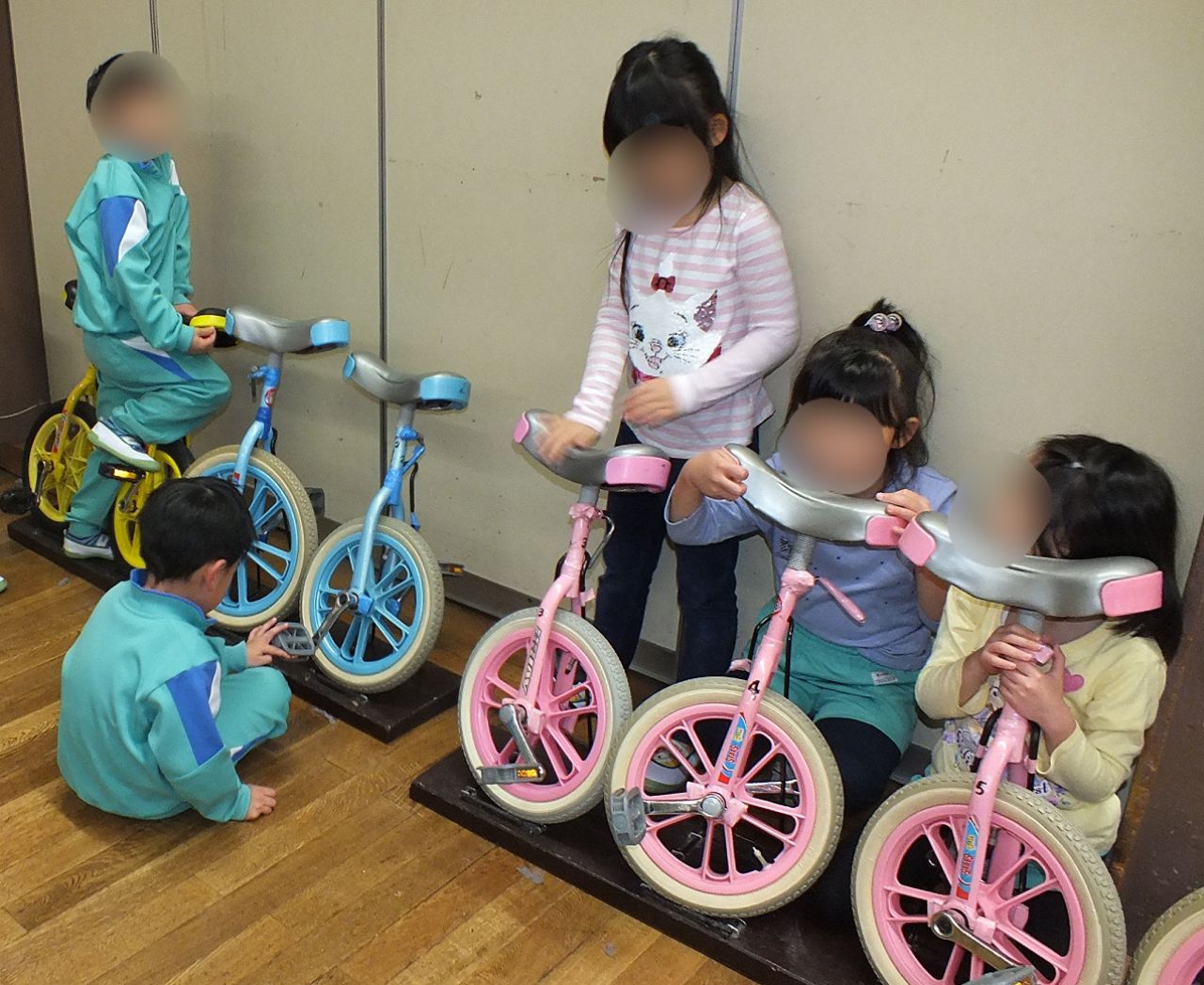 あつまさ先生 そうです。小学校の教員時代、特に小規模校勤務の時は、体育授業で積極的に一輪車を取り入れたところ1年生でも短期間で乗れるようになったので、幼稚園児にも挑戦させてみようかなと思いました。