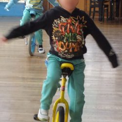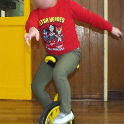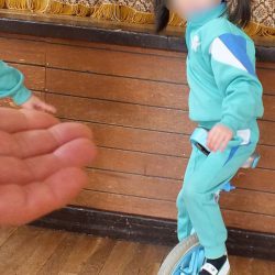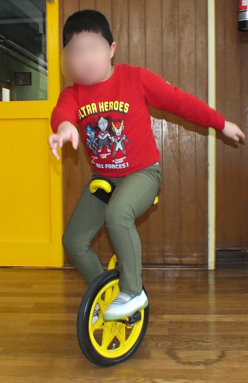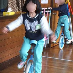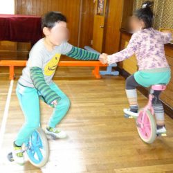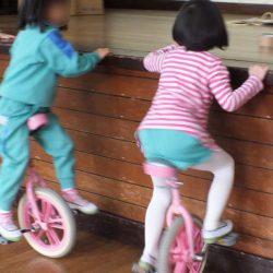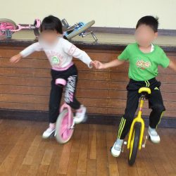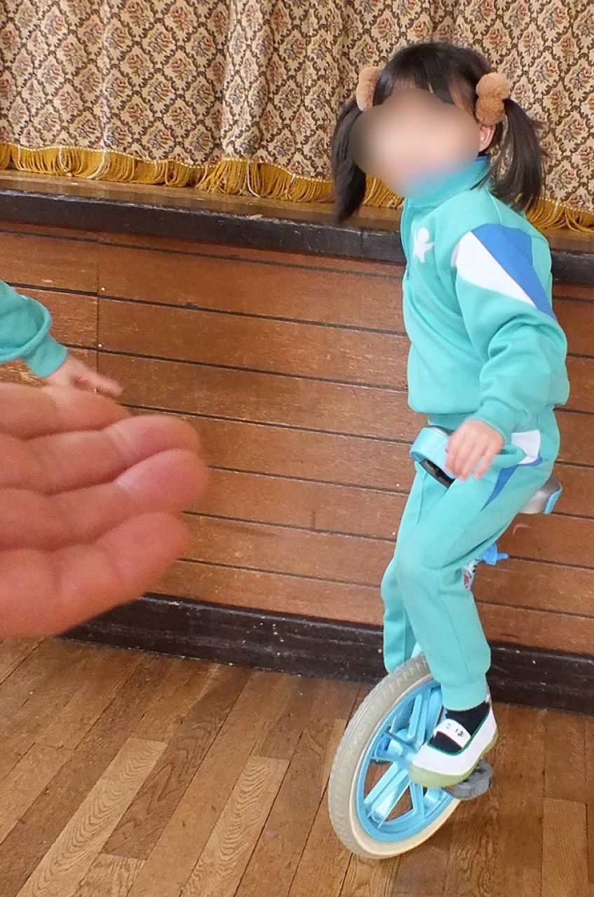 あつまさ先生 幼稚園で一輪車を取り入れて、一番初めに乗れるようになったのは年長の女の子Tさんでした。その子は、児童館でも練習していたこともあり、2~3週間ほどでお遊戯室を横断できるまでに上達しました。もちろん、一生懸命練習した賜です。