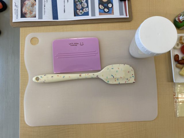 生地を切り分けるためのカード(なければ包丁で代用可)やゴムベラ、打ち粉を振りかけるための容器、生地をこねるためのシートなど、写真のものは全て100円均一で用意しました!