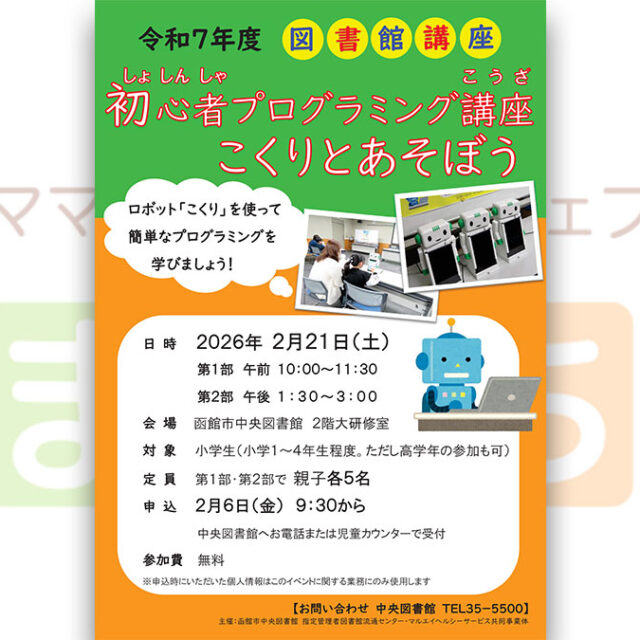 イベント 図書館講座「初心者プログラミング講座 こくりとあそぼう」 2月21日(土) 2026年2月21日(土)【図書館講座「初心者プログラミング講座 こくりとあそぼう」】が開催されます! おやこ学ぶ 2026.02.12 おやこイベント