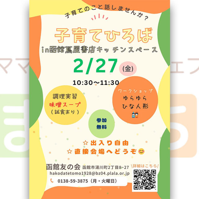 イベント 【函館友の会】子育てひろばin函館蔦屋書店キッチンスペース 2月27日(金) 2026年2月27日(金)【函館友の会】子育てひろばin函館蔦屋書店が開催されます♪子育ての話をしたり、試食ありの料理実習(今回は味噌スープ!)などみんなで楽しく交流できます♪ おやこプレママママ作る学ぶ 2026.02.24 おやこイベントプレママママ