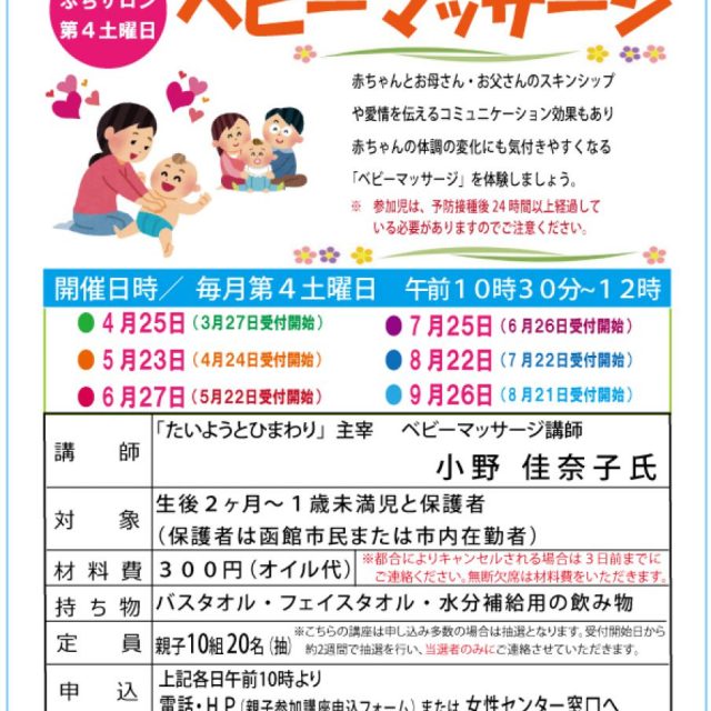 函館市女性センターで7月25日開催♪ベビーマッサージを体験してみませんか(*^^*)
