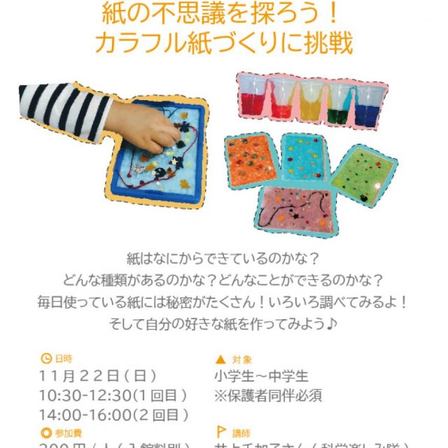 11月22日(日)はこだてみらい館で開催の親子科学ワークショップ【紙の不思議を探ろう!カラフル紙づくりに挑戦】紙の秘密を学びながら、好きな紙まで作っちゃいます♪