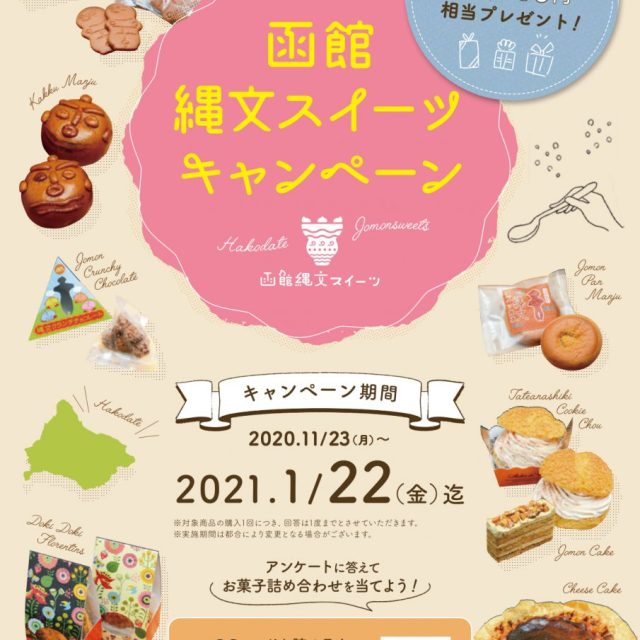 2020年11月23日~2021年1月22日【函館縄文スイーツキャンペーン】対象店舗の「函館縄文スイーツ」を買ってアンケートに答えると抽選でお菓子の詰め合わせが当たるキャンペーン!