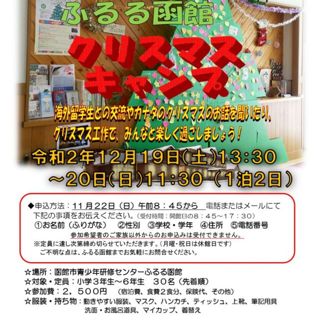 2020年12月19日(土)~20日(日)【ふるる函館 クリスマスキャンプ】が開催されます♪海外留学生との交流やカナダのクリスマスのお話しを聞いたり、クリスマス工作で、みんなと楽しく過ごしましょう!