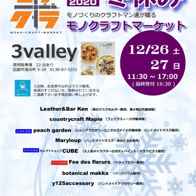 2020年12月26日(土)、27日(日)【2020冬休み 函館モノクラフトマーケット】が開催されます!今年最後のモノクラ、革のマスクホルダーや大人気キャラクターのボディペイントなどをご用意してお待ちしております!