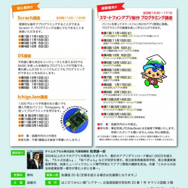 イベント 函館プログラミング教室 12月5日(土)~12月13日(日) 12月5日、6日、12日、13日函館プログラミングが開催♪初心者向け、経験者向けの講座があります。今後の日程は画像を拡大してご確認くださいね! キッズ学ぶ 2020.11.30 イベントキッズ