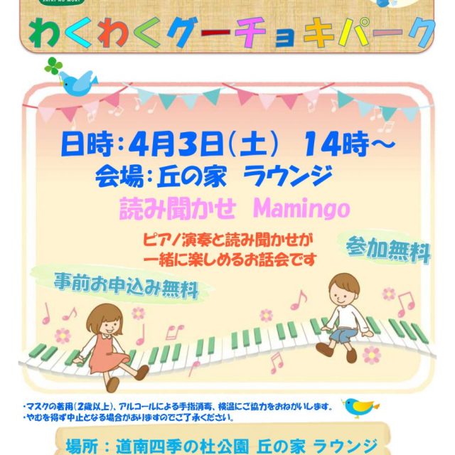 イベント 【開催中止】読み聞かせ会わくわくグーチョキパーク 4月3日(土) 2021年4月3日(土)道南四季の杜公園 丘の家ラウンジにて【読み聞かせ会わくわくグーチョキパーク】が開催されます!保育士幼稚園資格をお持ちの二人による楽しいピアノ演奏と読み聞かせを是非お楽しみください♪ おやこ体験延期・中止(2021) 2021.03.16 おやこイベント