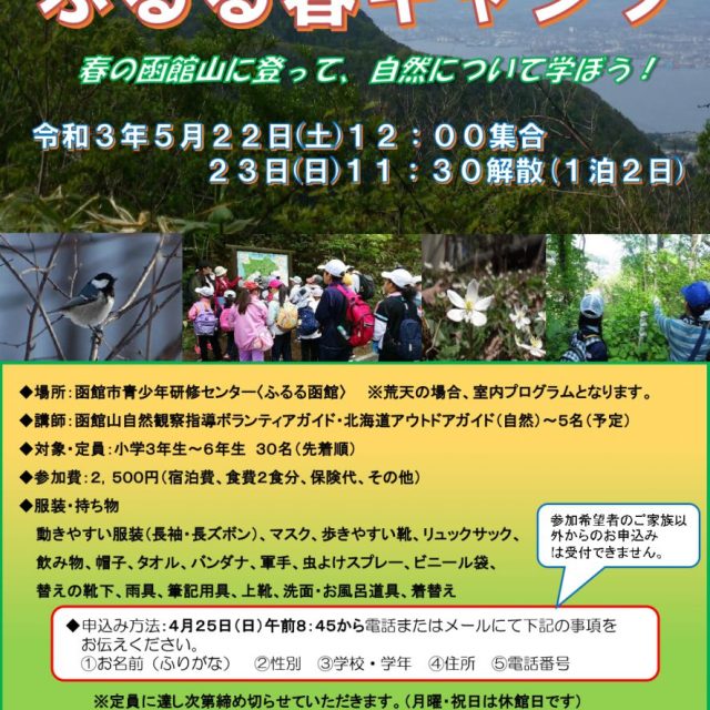 イベント ふるる函館 ふるる春キャンプ 5月22日(土)~5月23日(日) 5月22日(土)23日(日)1泊2日で開催の【ふるる函館 ふるる春キャンプ】をご紹介しています。1泊2日のプログラム(*^^*)親と離れて宿泊するのは、子どもにとって大きな経験になりますね♪4月25日から受付開始です! キッズ体験学ぶ 2021.04.21 イベントキッズ