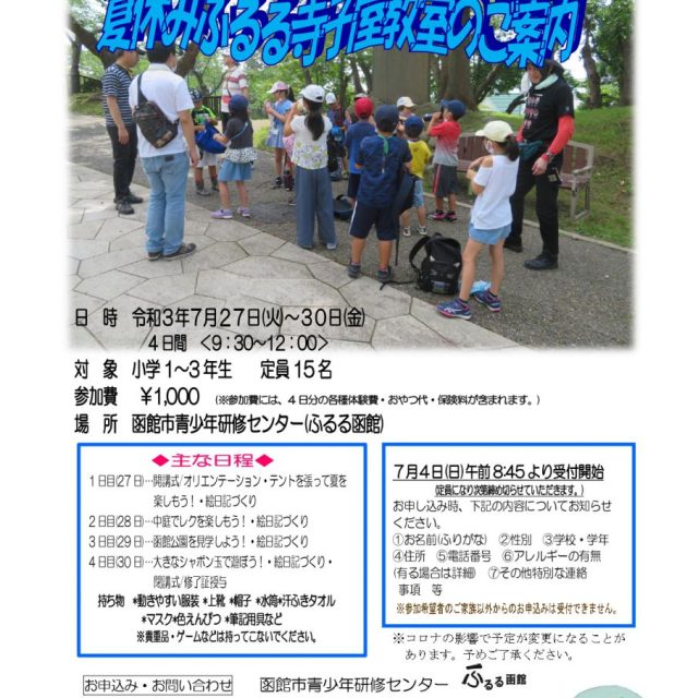 イベント 夏休み ふるる函館寺子屋教室 7月27日(火)~7月30日(金) 2021年7月27日(火)~30日(金)【夏休み ふるる函館寺子屋教室】夏休みの楽しい思い出作りにいかがですか?レクリエーションを楽しんだり、函館公園を見学したり、大きなシャボン玉で遊んだり♪その日の出来事を絵日記に記すので、自由研究としてもばっちりですね♪ キッズ体験 2021.06.28 イベントキッズ