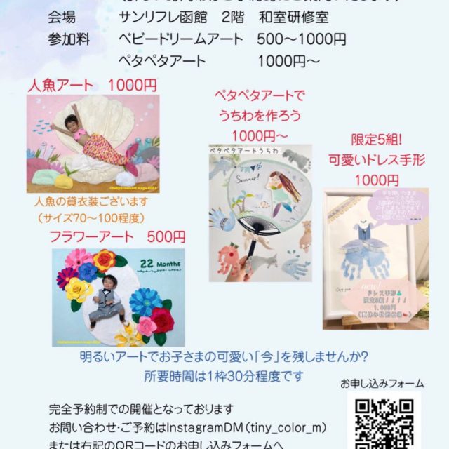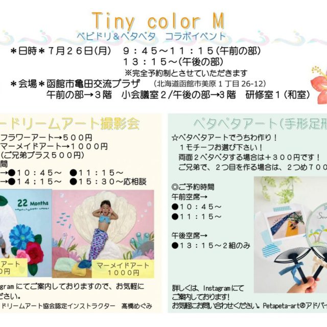 イベント 【Tiny color M】ベビドリ&ペタペタ コラボイベント(サンリフレ) 7月30日(金) ベビードリームアート&ペタペタアートコラボイベントのTiny color Mです!7月30日(金)にサンリフレ函館様2階和室研修室にて、開催いたします♪ おやこ体験 2021.07.20 おやこイベント