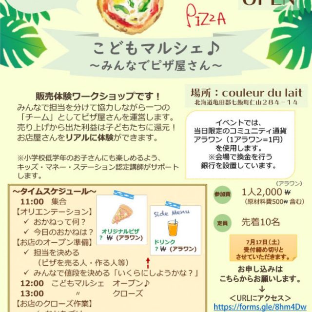 イベント こどもマルシェ♪~みんなでピザ屋さん~ 【体験型キッズワークショップ】 7月24日(土) 7月24日(土)couleur du lait(なゆらの森)で開催されるこどもマルシェ♪~みんなでピザ屋さん~ご紹介しています♪緑いっぱいの中で、1日限定オープンの子どもたちのピザ屋さん♪体験型キッズワークショップですよ~♪ キッズ体験学ぶ 2021.07.02 イベントキッズ