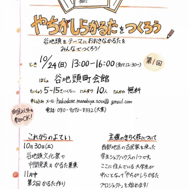 イベント 【第1回】やちがしらかるたをつくろう 10月24日(日) 2021年10月24日(日)【第1回やちがしらかるたをつくろ】谷地頭を探索しながら、かるたの文を考え、大きなかるたを作ってみよう! キッズ作る 2021.10.12 イベントキッズ