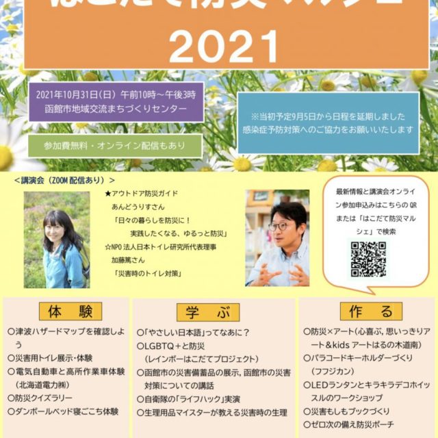 イベント はこだて防災マルシェ 2021 10月31日(日) 10月31日(日)函館市地域交流まちづくりセンターで開催される、函館防災マルシェ2021をご紹介♪ おやこキッズ体験学ぶ 2021.10.01 おやこイベントキッズ
