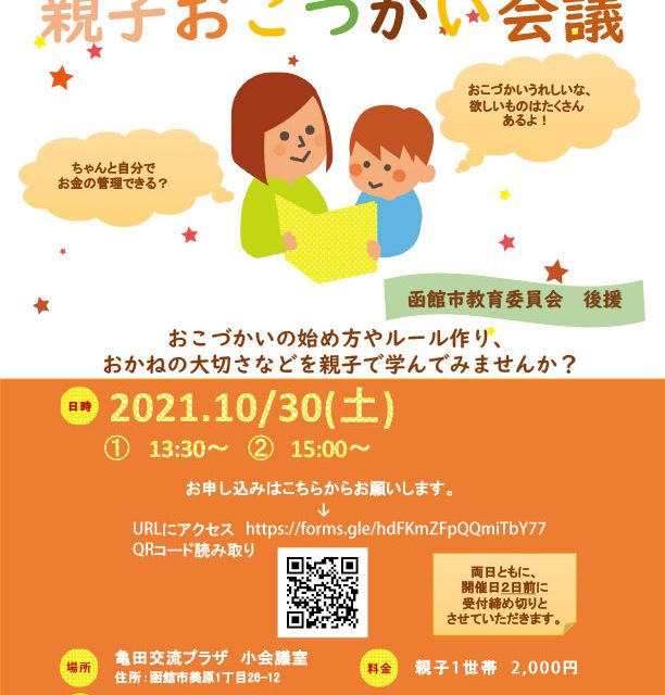 イベント 親子おこづかい会議 10月30日(土) 10月30日(土)函館市亀田交流センターで開催の【親子おこづかい会議】をご紹介♪親子にお金の大切さを学びましょう(*^^)v おやこ学ぶ 2021.10.14 おやこイベント