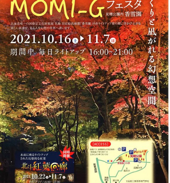 イベント はこだてMOMI-Gフェスタ 10月16日(土)~11月7日(日) 10月16日(土)~11月7日(日)まで、見晴公園内の香雪園でMOMI-Gフェスタが開催です(^^)/お子さんと落ち葉を拾いながら夜のお散歩にいかがですか🍂いつもとは違う香雪園の様子は新鮮ですよ♪ おやこ見る 2021.10.08 おやこイベント