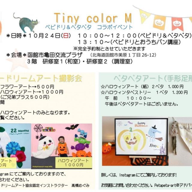 イベント 【Tiny color M】ベビドリ&ペタペタ ハロウィンイベント 10月24日(日) ベビドリ&ペタペタ コラボイベントが開催されます♪今月のテーマは「ハロウィン」です(^^)/午後の部では初のおうちパン講座もお楽しみいただけます! おやこ体験 2021.10.06 おやこイベント