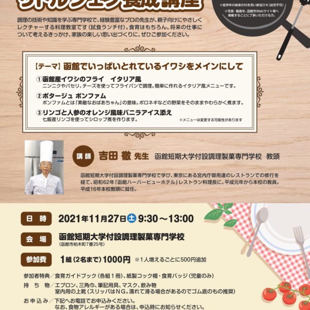 イベント リトルシェフ養成講座 11月27日(土) 2021年11月27日(土)【リトルシェフ養成講座】が開催されます。函館短期大学付設調理製菓専門学校の先生を講師に、親子向けにやさしくレクチャーしてくれる料理教室。食育はもちろん、将来の仕事について考えるきっかけ、家族の楽しい思い出づくりにぜひご参加ください♪ おやこ体験作る 2021.10.25 おやこイベント