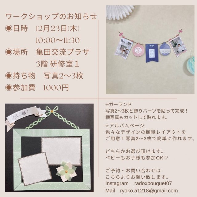 イベント 【ワークショップ】手作りアルバム教室 12月23日(木) 2021年12月23日(木)【アルバム教室ワークショップ】が開催されます♪今回は写真を貼って飾れるガーランド作りとアルバムページ作りからどちらかを作成します。 ママ作る 2021.12.16 イベントママ