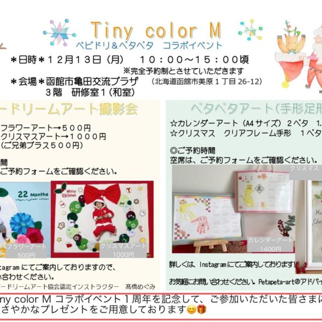 イベント 【Tiny color M】ベビドリ&ペタペタ イベント 12月13日(月) ベビドリ&ペタペタ コラボイベントが開催されます♪今月のベビドリのテーマは「クリスマスアート」、ペタペタは「クリスマスとカレンダーアート」です。 おやこ2021クリスマス体験 2021.12.06 おやこイベント