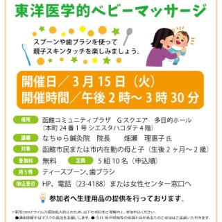 イベント まちかど相談室 東洋医学的ベビーマッサージ 3月15日(火) 3月15日(火)函館コミュニティプラザGスクエアで開催のまちかど相談室【東洋医学的ベビーマッサージ】をご紹介しています♪ おやこ体験 2022.02.14 おやこイベント