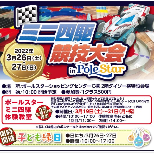 イベント ミニ四駆競技大会 in PoleStar 3月26日(土)~3月27日(日) 開催場所 ポールスターショッピングセンターC棟2階ダイソー横 特設会場上位入賞者には豪華景品プレゼント!買ったばかりで改造していない方も安心の「ノーマルクラス」も開催♪是非挑戦してみてくださいね!お楽しみ抽選会もあります!子ども縁日も同時開... おやこキッズパパ体験 2022.03.17 おやこイベントキッズパパ