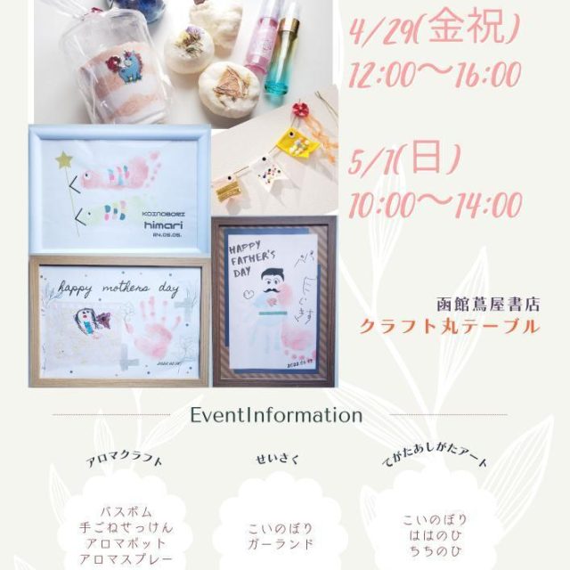 イベント いっしょに作る、おやこのじかん(4/29) 4月29日(金) 2022年4月29日(金)【いっしょに作る、おやこのじかん】アロマクラフト、手足足形アート、こいのぼりガーランドを親子で一緒に作りませんか? おやこ作る 2022.04.25 おやこイベント
