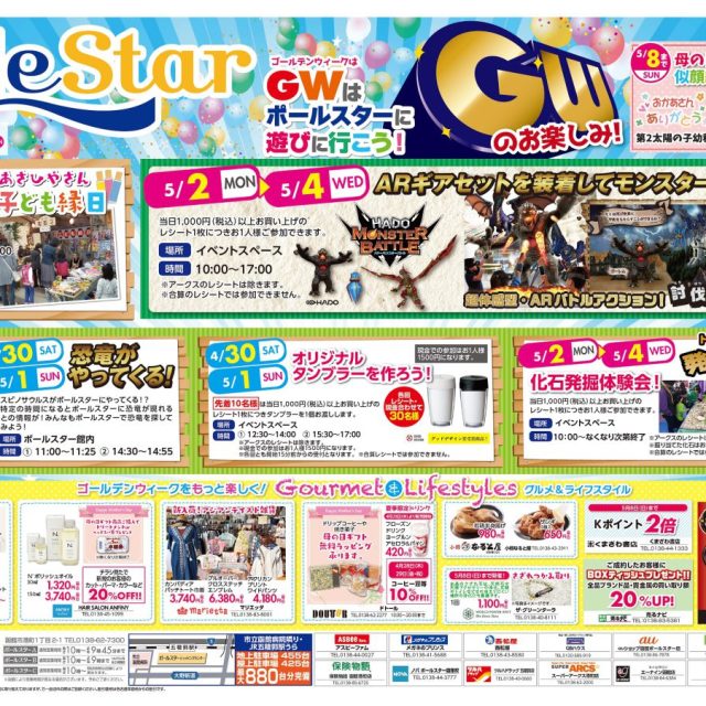 イベント GWはポールスターに遊びに行こう! 4月29日(金)~5月8日(日) 2022年4月29日(金)~5月8日(日)ポールスターのGWイベントが開催されます♪駄菓子屋あさひやさんのこども縁日や、館内に恐竜がやってきたり!?わくわく楽しいイベント盛りだくさんです♪ おやこショッピング体験 2022.04.27 おやこイベント