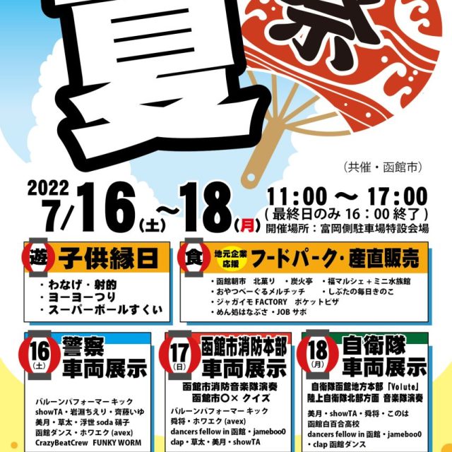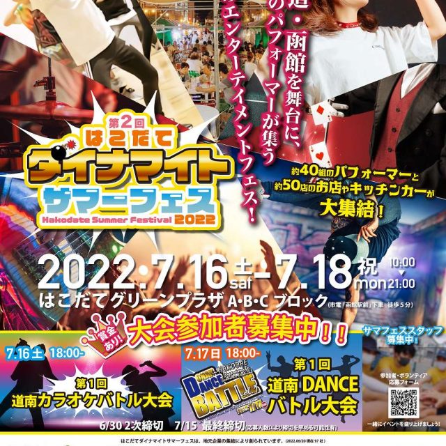 イベント 【日程変更あり】第2回 はこだてダイナマイトサマーフェス2022 7月16日(土)~7月18日(月) 7月16日(土)、17日(日)、18日(月)の3日間、はこだてグリーンプラザで開催の【第2回 はこだてダイナマイトサマーフェス2022】ご紹介しています♪DANCEや歌のパフォーマンスの他、キッチンカーやグルメも楽しめるイベントです♪ おやこキッズショッピング体験見る食べる 2022.06.22 おやこイベントキッズ