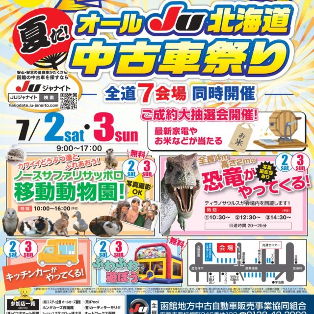 イベント 夏だ!オールJU北海度中古車祭り 7月2日(土)~7月3日(日) 2022年7月2日・3日【夏だ!オールJU北海度中古車祭り】子どもたちも楽しめる移動動物園や、ふわふわドーム、恐竜の出現などイベントも盛りだくさん♪ おやこ体験食べる 2022.06.16 おやこイベント