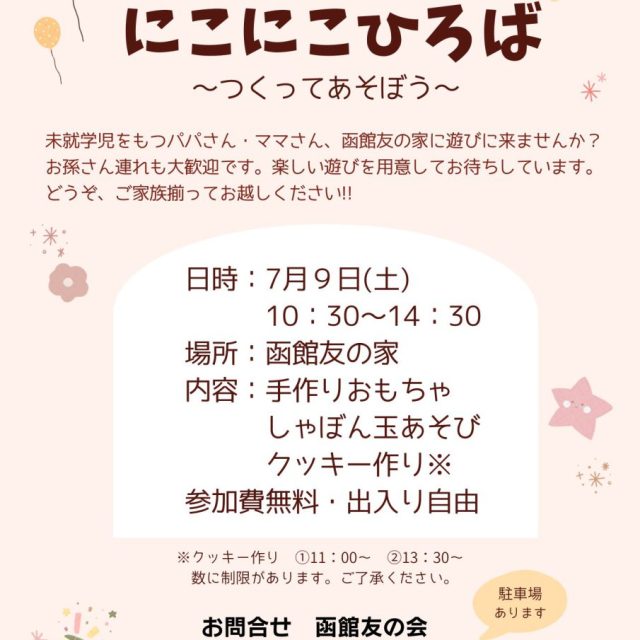 イベント にこにこひろば~つくってあそぼう~ 7月9日(土) 2022年7月9日(土)【にこにこひろば~つくってああそぼう~】楽しい遊びを用意してお待ちしております♪ご家族揃って、函館友の会に遊びにいらしてくださいね♪ おやこ体験作る 2022.07.05 おやこイベント