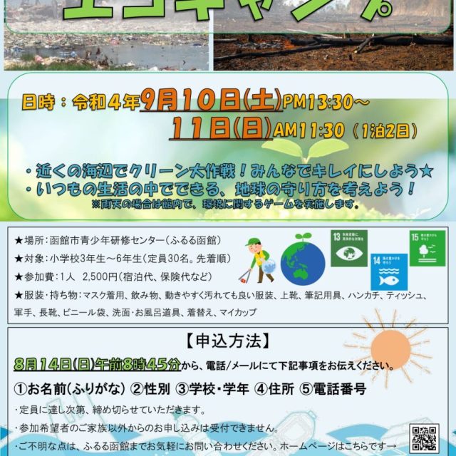 イベント 【ふるる函館】エコキャンプ 9月10日(土)~9月11日(日) 近くの海辺でクリーン大作戦!みんなでキレイにしよう、いつもの生活の中でできる、地球の守り方を考えよう! キッズ体験 2022.08.02 イベントキッズ
