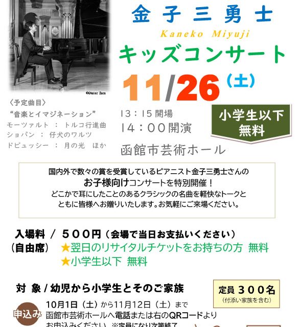 イベント 金子三勇士キッズコンサート 11月26日(土) 11月26日(土)函館市芸術ホールで【金子三勇士キッズコンサート】が開催♪どこかで耳にしたことがある名曲をお届けします! おやこ体験見る 2022.09.28 おやこイベント