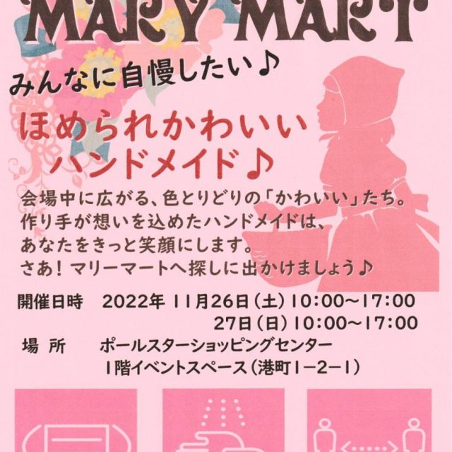 イベント MARY MART 11月26日(土)~11月27日(日) 11月26日(土)27日(日)の2日間、ポールスターショッピングセンターで開催の【MARY MART】をご紹介♪ワークショップも開催ですよ! おやこキッズショッピング体験 2022.10.13 おやこイベントキッズ