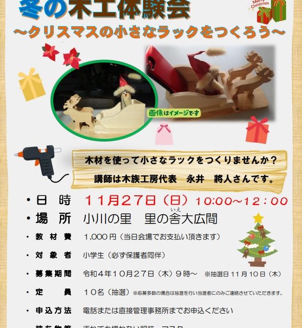 イベント 冬の木工体験会~クリスマスの小さなラックをつくろう~ 11月27日(日) 開催場所 北海道立 道南四季の杜公園 小川の里 里の舎大広間木材を使って小さなラックをつくりませんか?講師は木族工房代表 永井將人さんです♪時間 10:00~12:00対象 小学生(必ず保護者同伴)持ち物 汚れても構わない服装・マスク参加料... おやこ2022クリスマス体験作る 2022.11.04 おやこイベント