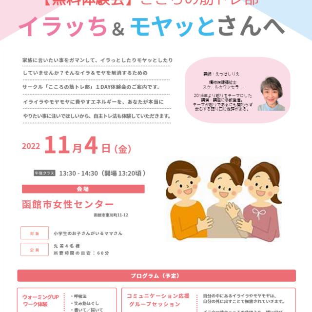 イベント 【無料体験会】こころの筋トレ部 11月4日(金) 2022年11月4日(金)【無料体験会】こころの筋トレ部 が函館市女性センターで開催されます♪家族に言いたい事をガマンして、イラッとしたりモヤッとしたりしていませんか?そんなイラ&モヤを解消しましょう! ママ学ぶ 2022.10.17 イベントママ
