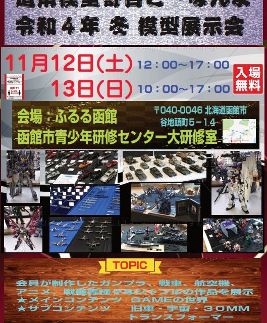 イベント 【道南模型寄合ど~なんよ】令和4年 冬 模型展示会 11月12日(土)~11月13日(日) 2022年11月12日(土)・13日(日)【道南模型寄合ど~なんよ】令和4年 冬 模型展示会 が開催されます♪ガンプラや戦車など様々なジャンルの作品が展示されます! おやこ見る 2022.10.26 おやこイベント