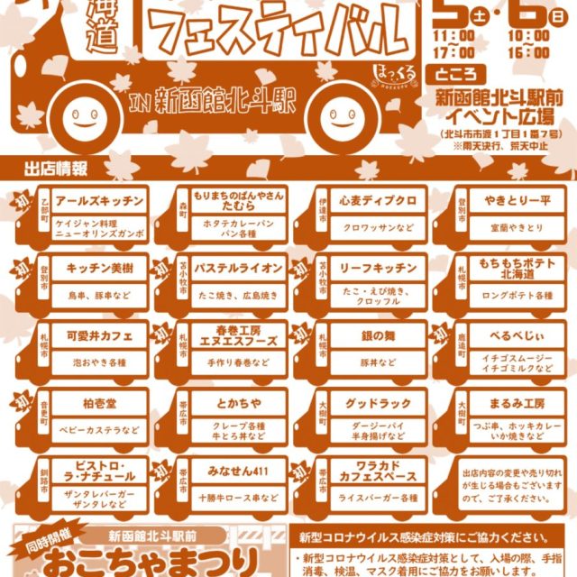 イベント 北海道キッチンカーフェスティバル IN 新函館北斗駅(同時開催 おこちゃまつり) 11月5日(土)~11月6日(日) 2022年11月5日(土)・6日(日)【北海道キッチンカーフェスティバル IN 新函館北斗駅】が開催されます!道内のおいしいものが大集合!「おこちゃまつり」も同時開催♪ おやこショッピング見る食べる 2022.10.27 おやこイベント