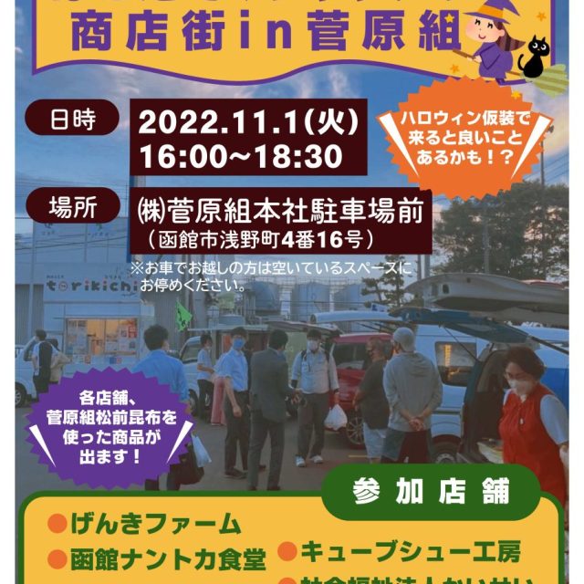 イベント はこだてマジックアワー商店街in菅原組 11月1日(火) 2022年11月1日(火)【はこだてマジックアワー商店街in菅原組】が開催されます♪菅原組松前昆布を使った商品も販売されますよ♪ おやこショッピング食べる 2022.10.27 おやこイベント