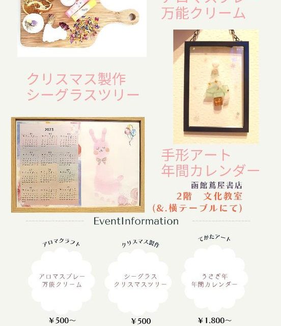 イベント 12/19 アロマクラフト&手形アート&クリスマス製作 12月19日(月) 12/19(月)函館蔦屋書店で【アロマクラフト&手形アート&クリスマス製作】開催♪来年の干支うさぎをモチーフにした手形アートカレンダーやクリスマスツリーなどなど♪ おやこ2022クリスマス体験作る 2022.11.22 おやこイベント