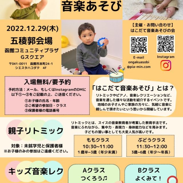 イベント 第2回 はこだて音楽あそび 12月28日(水)~12月29日(木) 2022年12月28日(水)29日(木)【第2回 はこだて音楽あそび】が開催されます♪未就学児向けの「親子リトミック」、小学生向けの「キッズ音楽レク」で一緒に音楽を通じて楽しみましょう! おやこ体験 2022.12.23 おやこイベント