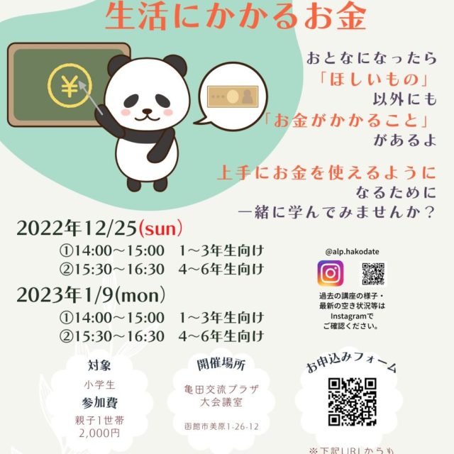 イベント 親子でお金を学ぶワークショップ 生活にかかるお金 12月25日(日) 12月25日(日)函館市亀田交流プラザ大会議室で開催のイベント【親子でお金を学ぶワークショップ 生活にかかるお金】をご紹介♪お金について学びましょう! おやこ学ぶ 2022.12.14 おやこイベント