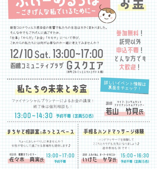 イベント ふぃーめるらぼ~ごきげんな私でいるために~ 12月10日(土) 12月10日(土)函館コミュニティプラザGスクエアで開催の【ふぃーめるらぼ~ごきげんな私でいるために~】をご紹介♪ ママ体験学ぶ 2022.11.07 イベントママ