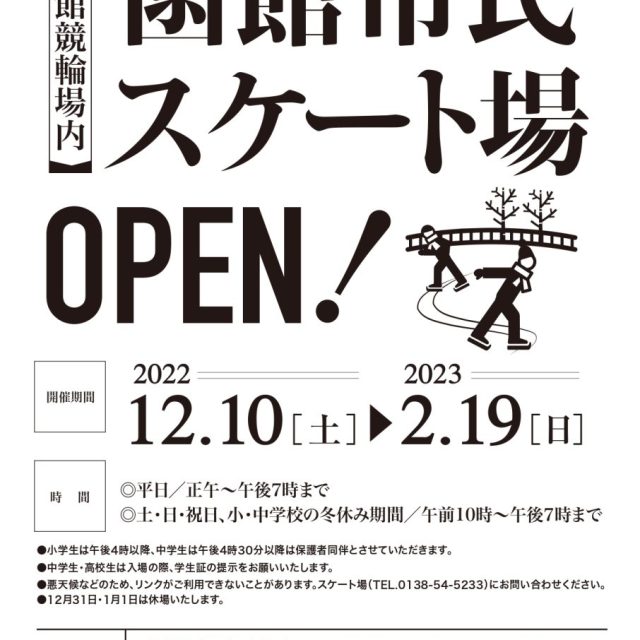 イベント 函館市民スケート場 OPEN! 12月10日(土)~2月19日(日) 12月10日(土)~2月19日(日)函館市民スケート場がオープンします! おやこキッズ体験 2022.11.25 おやこイベントキッズ