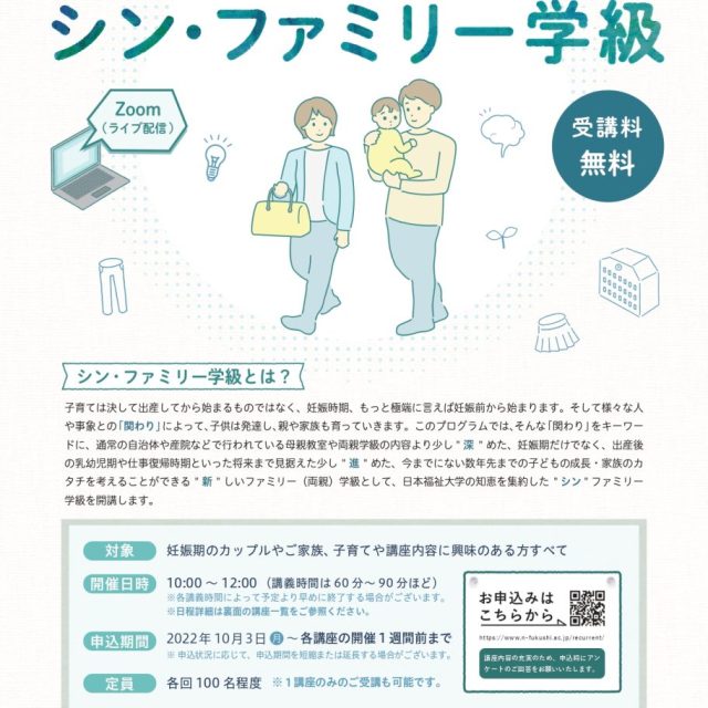 イベント シン・ファミリー学級 11月19日(土)~1月29日(日) 【シン・ファミリー学級】日本福祉大学が妊娠期のカップルやご家族を中心に、妊娠・出産・子育てに興味のある全ての方を対象として、親になること、家族が増えること、子ども・家族との生活や将来のことについてなど、正しい知識をもとに一緒に考えるコンテンツシリーズとして「日本福祉大学の『関わり』からひも解くシン・ファミリー学級」を無料で開講します。 パパプレママママ学ぶ 2022.10.25 イベントパパプレママママ