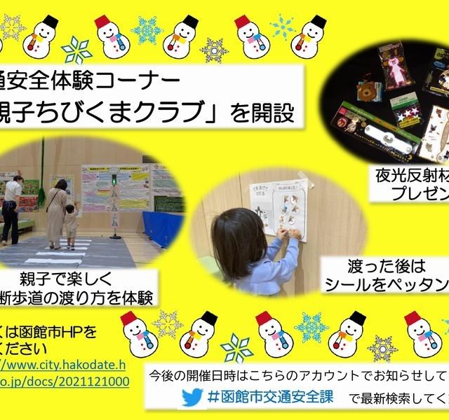 イベント 交通安全体験コーナー「親子ちびくまクラブ」 1月16日(月) 2023年1月16日(月)【交通安全体験コーナー「親子ちびくまクラブ」】が函館市亀田交流プラザで開催されます。市の交通指導員さんと一緒に幼いうちから交通ルールを楽しみながら学ぼう! おやこ体験 2023.01.13 おやこイベント